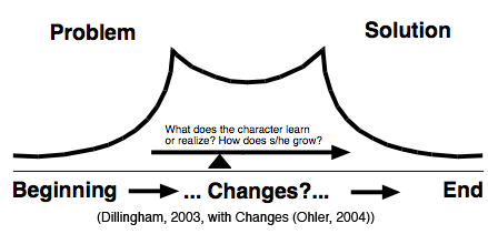 Changes. The main character transforms in some significant way, such as learning something important, becoming more skilled, mature or courageous, or developing personal insight and understanding. In great stories the character’s transformation is so great that we, the listening audience, feel transformed as well. However, this is the simple explanation. I devote an entire chapter in my book to transformation because it can be a complex topic. For example, with documentaries sometimes the primary transformation is in audience members, as we learn about a situation that has an effect on us. With academic new media stories, transformation occurs by students showing what they have learned. See the chapter for much more on this topic.